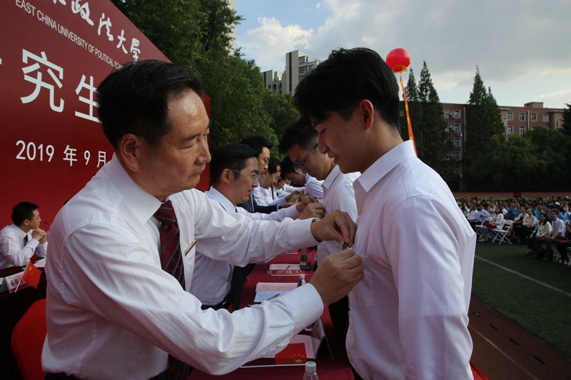 典礼上,校领导为研究生新生代表佩戴校徽。