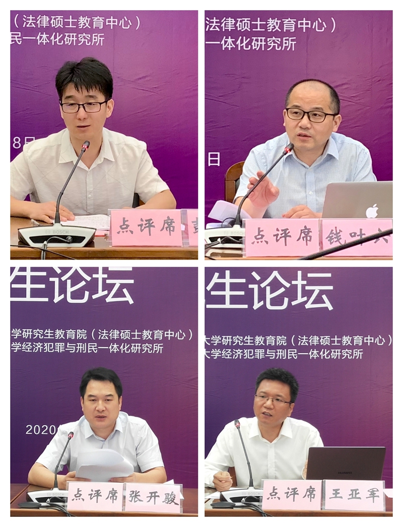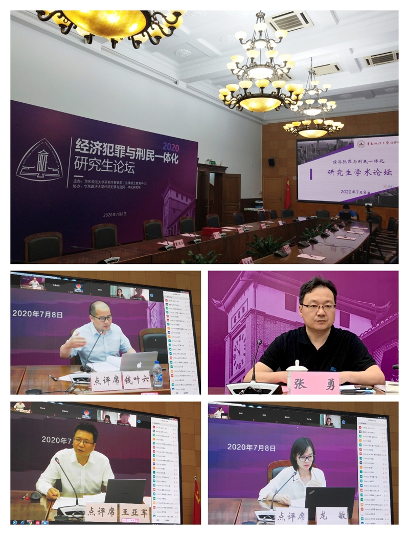 7月8日上午,由华东政法大学研究生教育院、法律硕士教育中心主办,经济犯罪与刑民一体化研究所协办的“经天杯”刑民一体化理论与实践研究生学术论坛在华东政法大学交谊楼圆桌会议厅召开。与以往学术论坛有所不同的是,此次论坛以线上、线下相结合的方式。京衡律师集团上海事务所高级合伙人、刑民交叉部主任、我校经济犯罪与刑民一体化研究所执行主任王亚军,上海政法学院刑事司法学院院长、教授彭文华,华东师范大学法学院教授、博士生导师、刑法学科带头人钱叶六,上海大学法学院副教授、硕士生导师张开骏,我校文伯书院副院长吴允锋教授以及马寅翔、龙敏、蒋太珂老师等校内外专家出席了线下会议,包括本届论文比赛获奖者、第七届高端法律创新人才夏令营近一百二十名营员在内的研究生参加了线上会议。