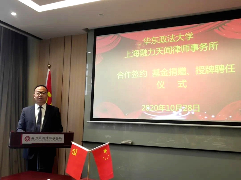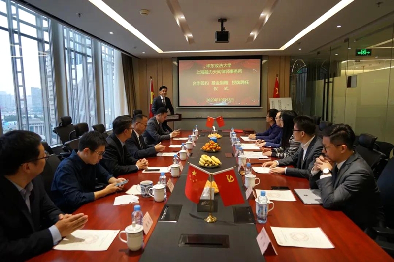 10月28日下午,我校研究生教育院与上海融力天闻律师事务所战略合作签约、卓越教育基金捐赠、科研实践基地授牌及法硕实训导师聘任仪式在上海金茂大厦融力天闻律所会议室顺利举行。研究生教育院院长洪冬英、社会协同处处长陈赛金、研究生教育院副院长张勇、法硕教育中心办公室主任戴国立,上海融力天闻律师事务所主任王世喜、执行主任沙佳伟、监事长王志勇、高级合伙人孙黎卿、潘若微、蒋辰逵、一级合伙人周可会等出席了仪式活动。