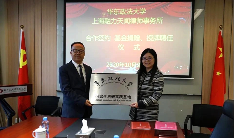 洪冬英院长与王世喜主任签署战略合作协议,并向王世喜主任颁授 “华东政法大学研究生科研实践基地”牌匾。
