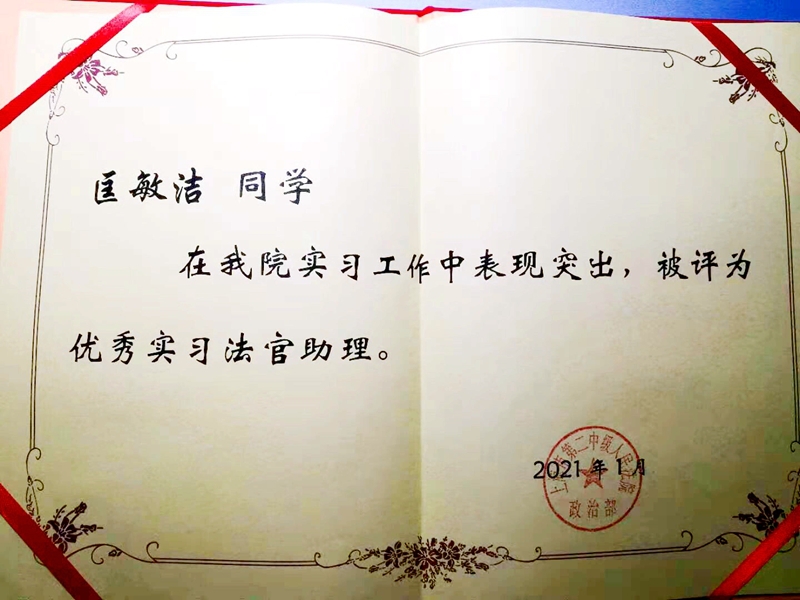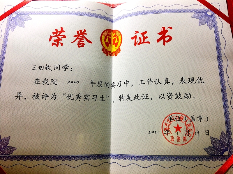 1月15日,三中院第六期“法院实习助理”项目结项工作顺利完成,王也钦同学获评“优秀实习生”。三中院政治部苗青老师指出,本期实习中,同学们参与了指导性案例编写、案件证据收集整理、案卷材料归档、论文与裁判文书撰写等工作,实习范围全面,实习内容丰富。实习生通过实践锻炼,进一步增强了对中国特色社会主义法治道路的理解和认同,提升了司法实践能力,同时,在参与审判辅助、司法调研等工作中,发挥专业特长,主动建言献策,为三中院工作的开展做出了积极的贡献。