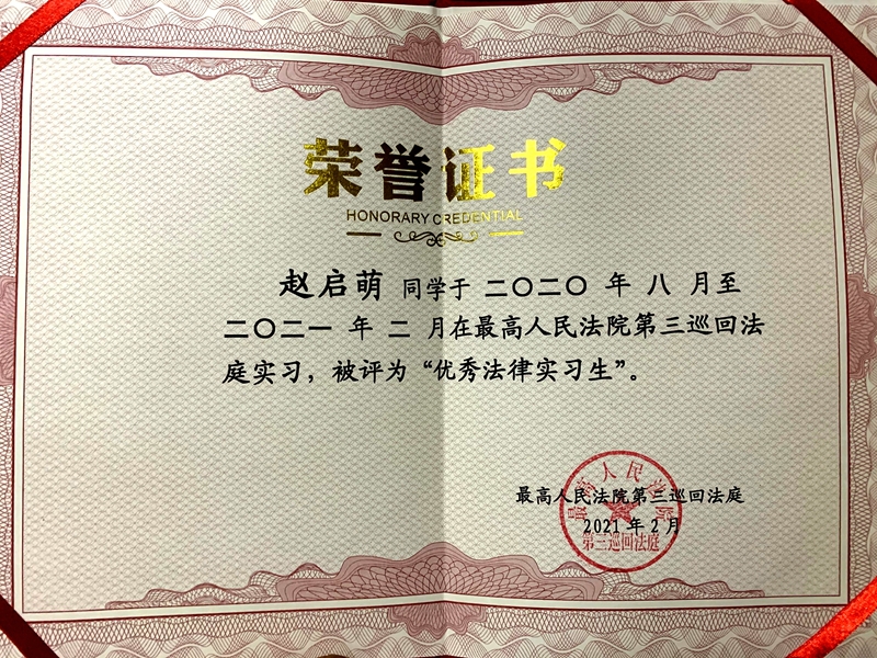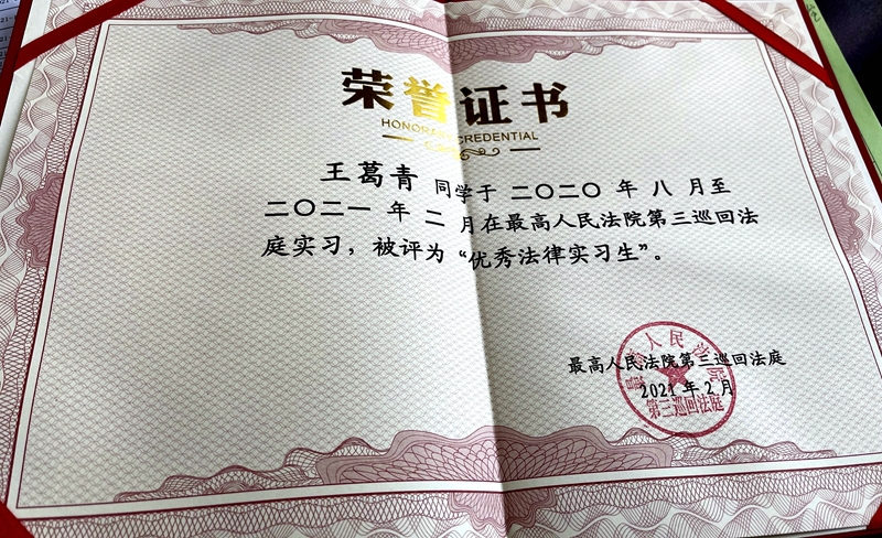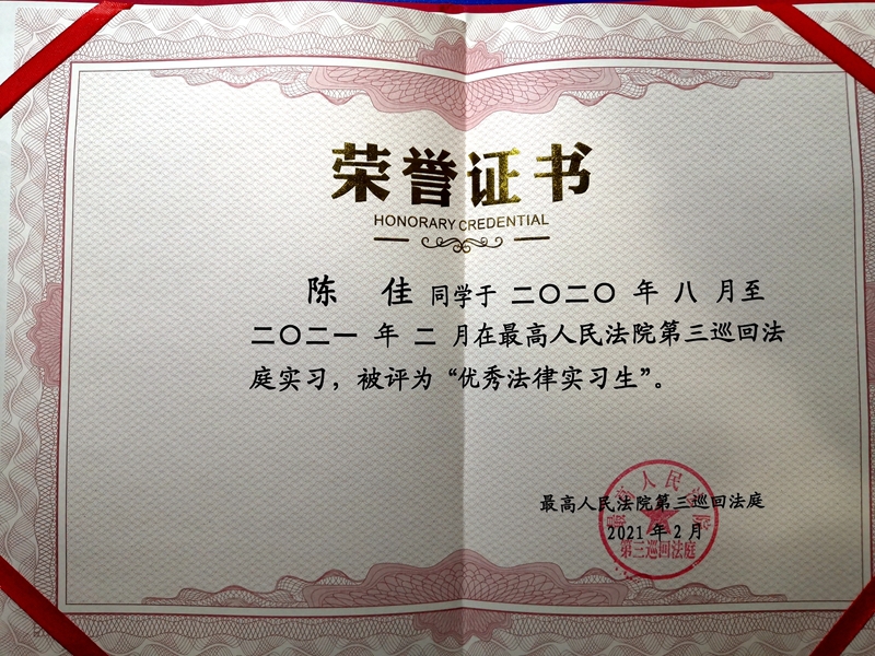 在半年的实习期内,3名同学分别进入民事和刑事审判团队担任实习法官助理,辅助参与案件记录、文书起草、司法调研及综合行政等工作,遵守庭内各项疫情防控制度,做到出庭必报备、出宁必报批,并配合三巡工作人员做好审判场所的疫情防控以及出庭人员的行程调查。她们谦逊好学、认真踏实的工作,得到了三巡领导和老师的一致好评,在2021年1月29日三巡召开的总结表彰大会上,我校3名研究生均获得“优秀法律实习生”的荣誉称号。