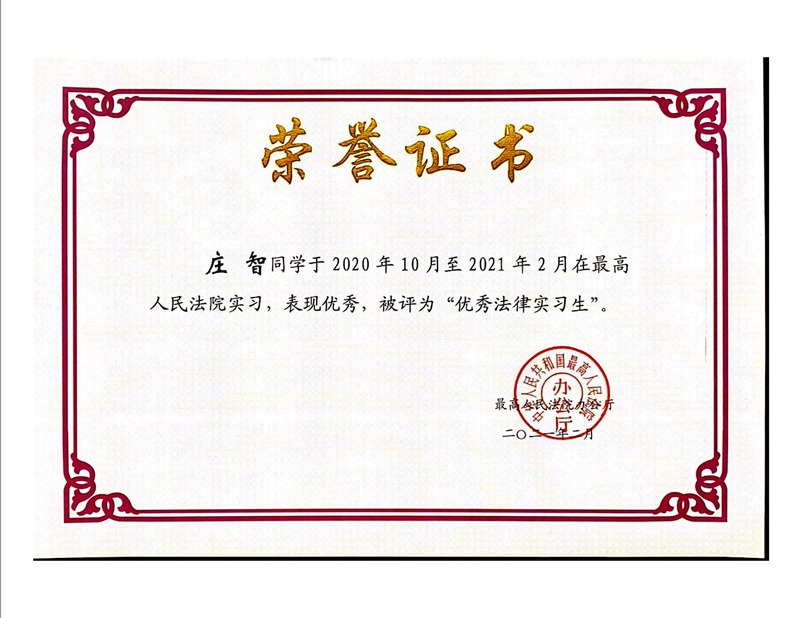 日前,为期五个月的最高人民法院第九批法律实习生项目顺利结束。在疫情防控常态化背景下,我校两名法律实习生2018级知识产权专业硕士研究生张一泓、2019级诉讼法学专业硕士研究生庄智严格遵守最高人民法院防疫规定,在自觉落实防疫要求的基础上有序完成实习任务,积极主动参与集体培训及学习实践活动,取得良好成效。其中,我校庄智同学荣获由最高人民法院办公厅、政治部、机关党委组织评选的“优秀法律实习生”称号。