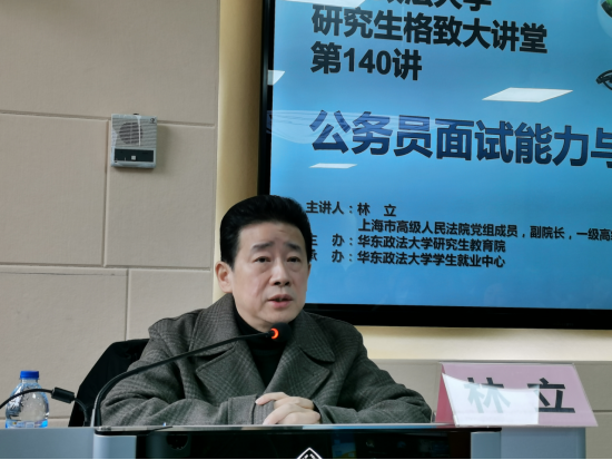 2021年3月17日下午,由华东政法大学研究生教育院主办,学生就业中心承办的“研究生格致大讲堂”第140讲开讲。上海市高级人民法院党组成员、副院长,一级高级法官林立应邀为我校学生作题为“公务员面试能力与技巧”的讲座。讲座由华东政法大学教授、博士生导师,研究生教育院院长洪冬英主持。讲座线下地点设在华政长宁校区新教301智慧教室,松江校区等不能现场参加的同学通过线上直播收听收看,共700余名同学参加。