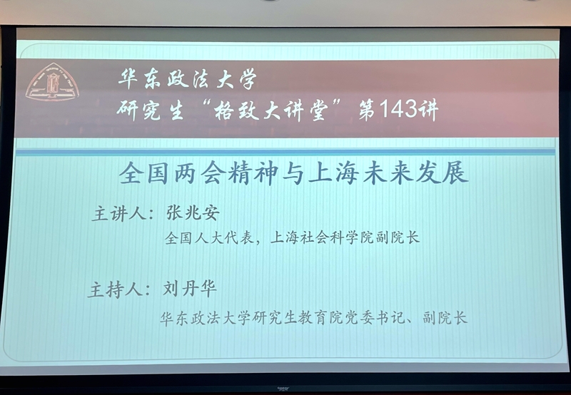 4月25日上午,由我校研究生教育院主办的“研究生格致大讲堂”第143讲在长宁校区图书馆四楼会议室举行。全国人大代表、上海社会科学院副院长张兆安应邀为我校师生做题为“全国两会精神与上海未来发展”的讲座,讲座由华东政法大学研究生教育院党委书记、副院长刘丹华主持。研究生教育院全体老师和我校研究生代表聆听了讲座。