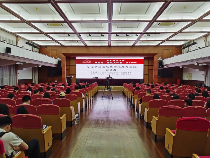 5月24日晚上,我校“研究生格致大讲堂”第145讲在长宁校区交谊楼基石厅举行。第十三届全国人民代表大会宪法和法律委员会副主任委员、中国法学会副会长、原最高人民法院党组副书记、副院长、审判委员会委员江必新教授应邀作题为《习近平法治思想的主题与主线》的主题讲座。讲座由校党委副书记、校长叶青教授主持。