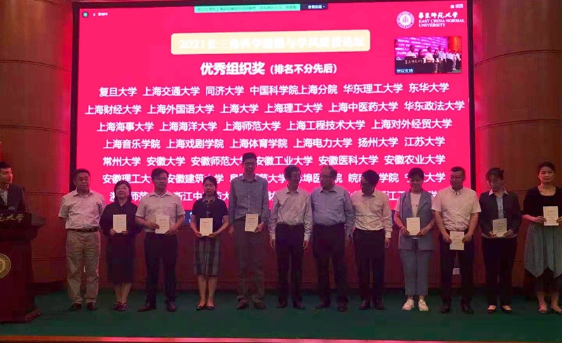 为深入学习贯彻习近平总书记在科学家座谈会上的重要讲话精神,进一步落实全国研究生教育会议精神,持续加强研究生科学道德教育和学风建设,6月10日,由上海市科学道德和学风建设宣讲教育领导小组办公室、上海市学位委员会办公室主办,华东师范大学承办的以“坚守学术诚信,弘扬科学家精神”为主题的首届长三角科学道德和学风建设论坛在华东师范大学举行。我校研究生教育院副院长史红光出席了开幕式,并代表学校上台领取了“优秀组织奖”证书。