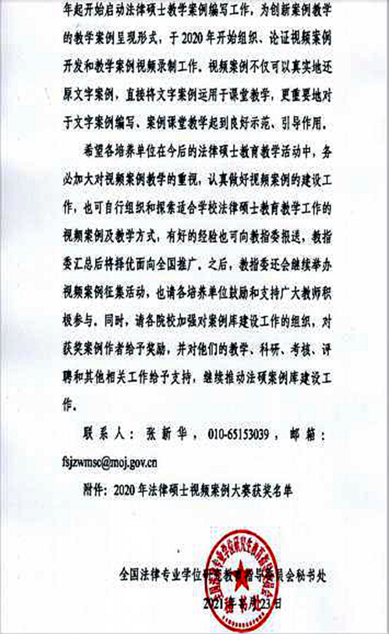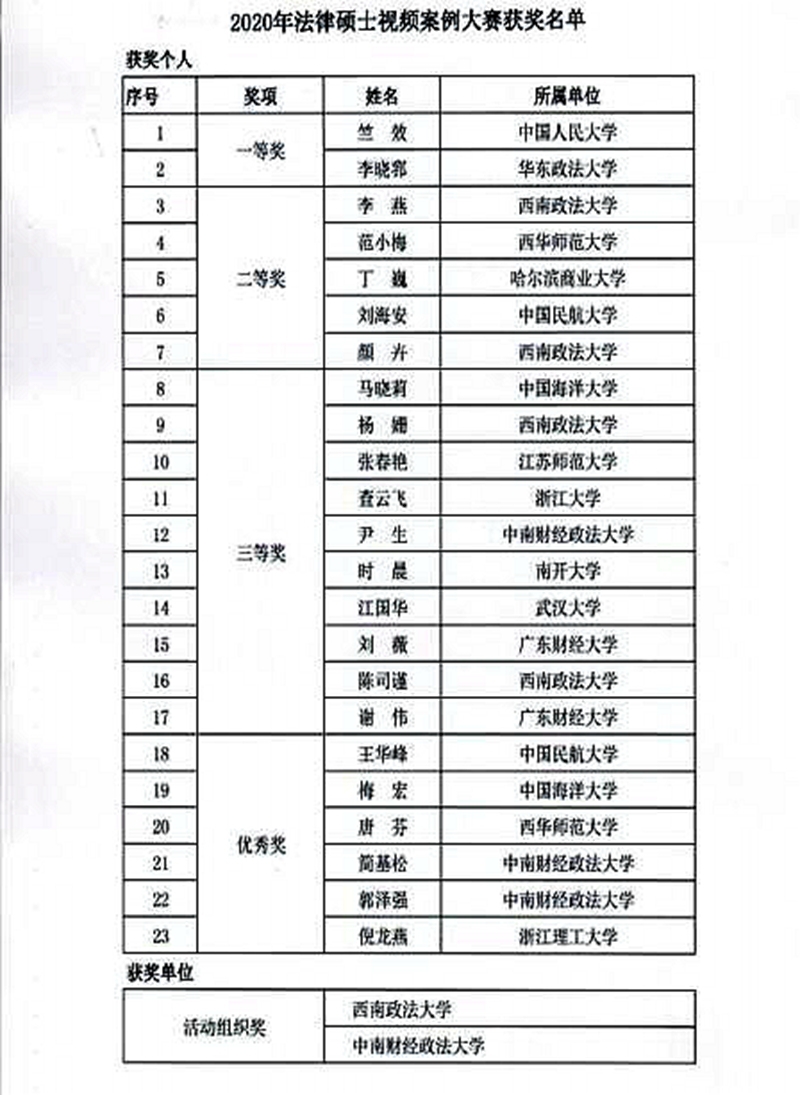 法律硕士视频案例大赛是全国法硕教指委推动法律硕士案例教学水平提升,规范案例教学内容及形式的重要举措。本届大赛共评出一等奖2名、二等奖5名、三等奖 10名、优秀奖6名、最佳组织奖2个。据悉,本届大赛是全国法硕教指委举办的首届视频案例大赛,获一、二、三等奖的视频案例视同教学案例库入库。