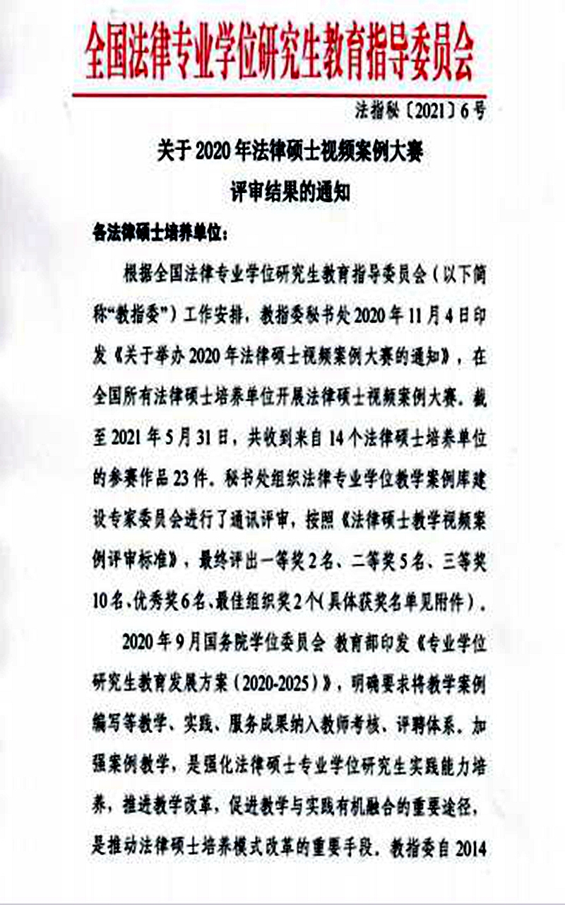 近日,全国法律专业学位研究生教育指导委员会公布了2020年法律硕士视频案例大赛获奖名单。我校李晓郛副研究员团队制作的“乌克兰诉俄罗斯运输限制案(全英文课程)”视频,获评一等奖,这也是我校近年来在法律硕士教学案例库建设中取得的最佳成绩。