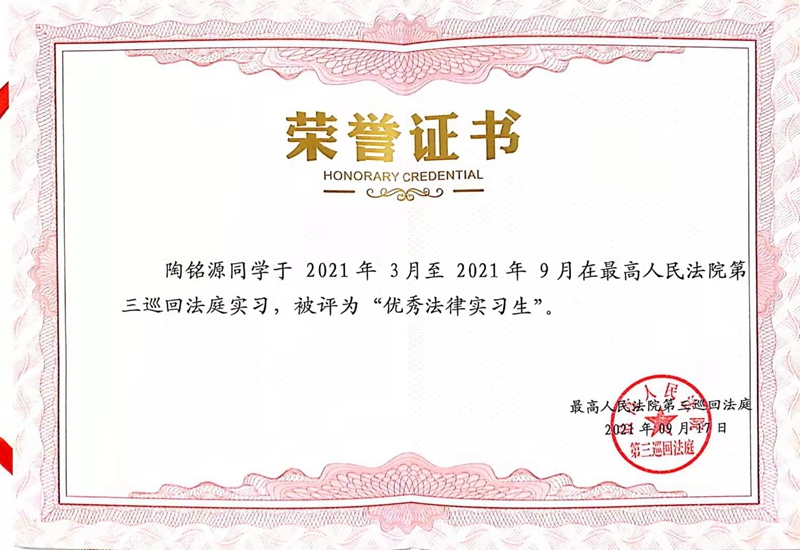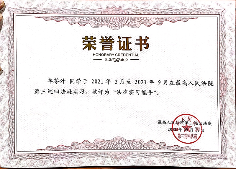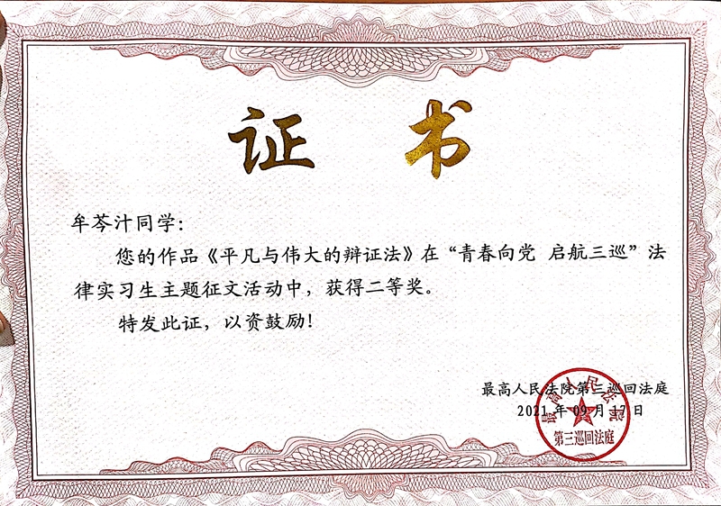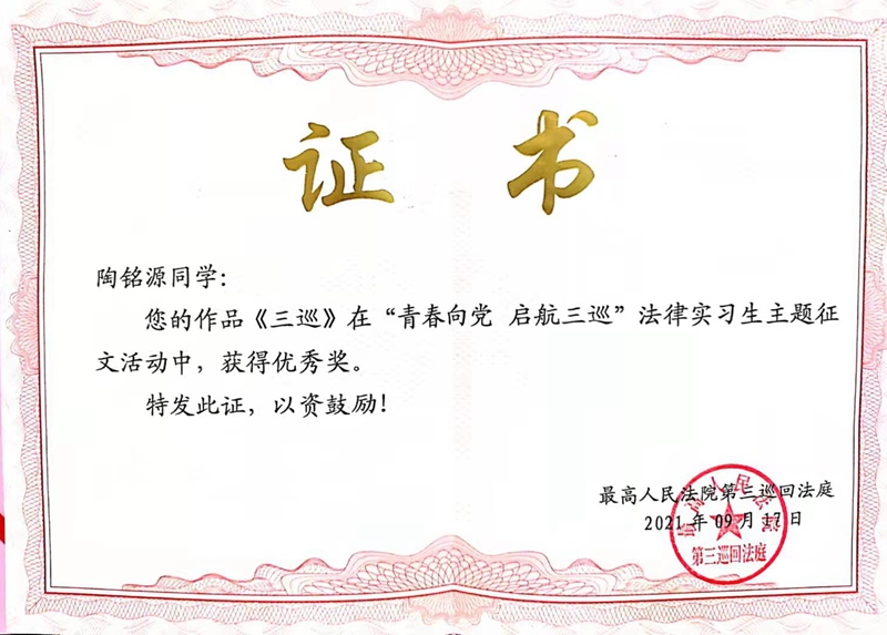 在半年的实习期内,2名同学分别进入刑事和行政审判团队开启实习生活,辅助参与案件审查与记录、文书起草与校对、司法调研与综合行政等工作,遵守庭内各项规章制度,并配合三巡工作人员做好疫情防控措施。他们勤勉认真、谦逊好学,在实习工作中表现出扎实的理论功底和严谨的工作态度。2021年9月17日三巡召开了总结表彰大会,我校研究生院培养办公室主任朱彦前往参会,会上陶铭源同学获得“优秀法律实习生”荣誉称号,牟芩汁同学获得“法律实习能手”的荣誉称号。在“青春向党 启航三巡”法律实习生主题征文活动中,牟芩汁同学的作品《平凡与伟大的辩证法》获得二等奖,陶铭源同学的作品《三巡》获得优秀奖。