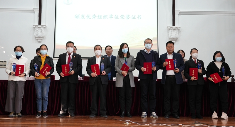 杜素娟宣读表彰决定,主席台就座领导为上海市第一中级人民法院等39家单位、易金淼等92名带教老师、孙玉丽等108名法律助理颁发荣誉证书和奖杯。