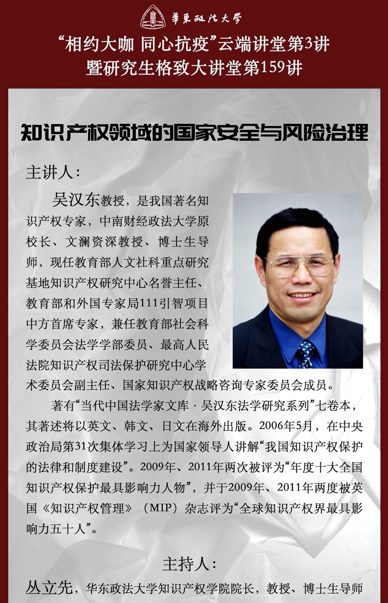 4月12日,由我校研究生院主办、各二级学院承办的“相约大咖 同心抗疫”云端讲堂系列讲座第三讲顺利举行。中南财经政法大学原校长、文澜资深教授、最高人民法院知识产权司法保护研究中心学术委员会副主任吴汉东应邀作了主题为“知识产权领域的国家安全与风险治理”的讲座。此次讲座也是我校研究生格致大讲堂第159讲,由我校知识产权学院院长丛立先教授主持,在线聆听的师生和社会人士超过2000人。
