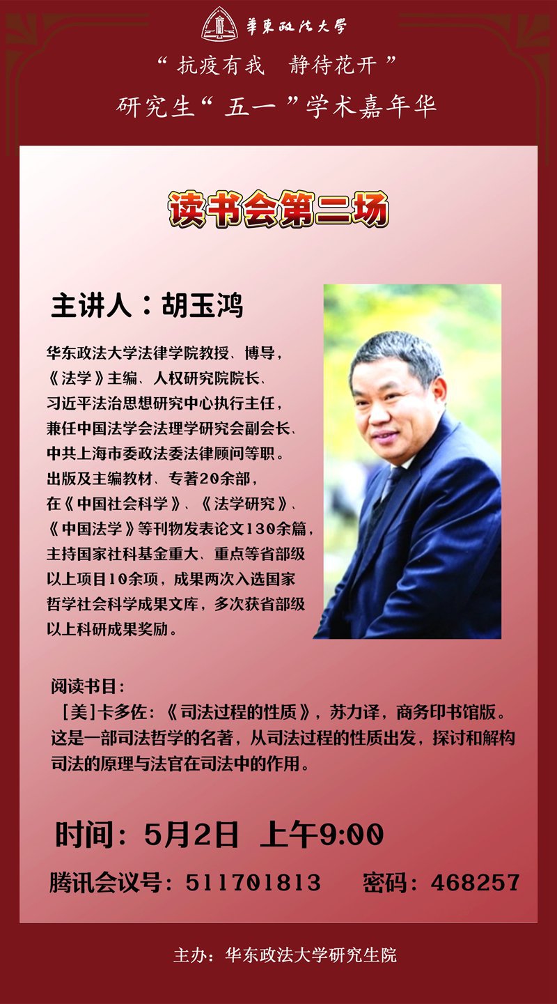 胡玉鸿,教育部长江学者特聘教授,华东政法大学法律学院教授、博士生导师,《法学》主编、人权研究院院长、习近平法治思想研究中心执行主任,兼任中国法学会法理学研究会副会长、中共上海市委政法委法律顾问等职。出版及主编教材、专著20余部,在《中国社会科学》、《法学研究》、《中国法学》等刊物发表论文130余篇,主持国家社科基金重大、重点等省部级以上项目10余项,成果两次入选国家哲学社会科学成果文库,多次获省部级以上科研成果奖励。较与功能的视角》《公司法的经济结构》《公司金融法律原理》等专著、译著二十余部。