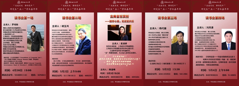 校内外专家齐聚,法律与音乐并行,理性与柔情相拥。本系列活动由四场读书会和一个音乐讲座组成。研究生院邀请上海市司法局副局长罗培新教授、《法学》主编胡玉鸿教授、民商法学博士生导师杨代雄教授、法政治学博士生导师组组长刘风景教授和上海音乐学院国际室内乐中心副主任吴淑婷教授担任此次活动嘉宾。读书会是拓展视野、精细思维、交流观点的重要平台,本系列四场读书会分别从商法、法理、民法与法哲学四个领域择书而读,推荐阅读了《公司法基础》《司法过程的性质》《法律行为论》和《权利话语——穷途末路的政治言辞》四本书。音乐讲座《敞开心扉,走进室内乐》更是秉承音乐可阅读的理念,带领师生了解音乐故事,理解作者心情,感受不同风格,品味时代特质。