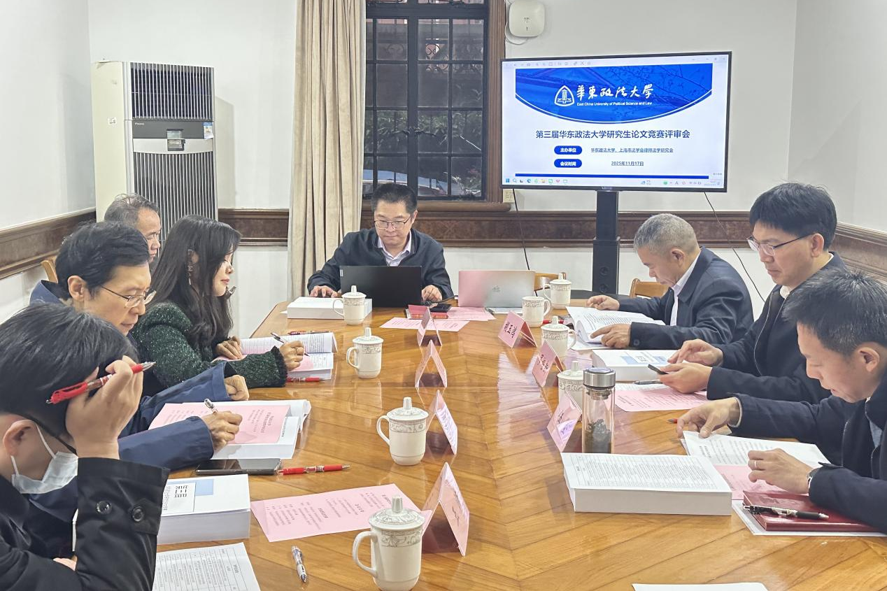 11月17日下午,由我校和上海市法学会律师法学研究会共同主办的第三届研究生论文竞赛(以下简称“论文竞赛”)评审委员会会议在长宁校区交谊楼召开。评委会主任、我校副校长罗培新,评委会主任、上海市法学会律师法学研究会会长、海华永泰律师事务所主任、党委书记马靖云,《法学》主编胡玉鸿,《政治与法律》副主编陈历幸,《华东政法大学学报》副主编王沛,经济法学院院长和评委会副秘书长、研究生院副院长伍坚作为评委会委员出席。会议由伍坚主持。